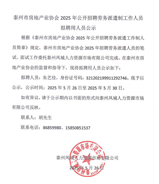 泰州市房地產(chǎn)業(yè)協(xié)會(huì)2025年公開(kāi)招聘勞務(wù)派遣制工作人員 擬聘用人員公示